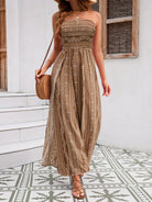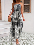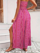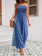 Embrace the ultimate in summertime luxury with our Women's Strapless Maxi Jumpsuit. This striking one-piece features a high-waisted smocked bodice that offers a secure, flexible fit while accentuating your natural silhouette. The design flows into dramatic, floor-skimming wide-leg trousers adorned with an intricate, ethnic-inspired paisley and geometric print. Crafted for both comfort and visual impact, the fluid fabric ensures a breezy, lightweight feel that moves gracefully with every step. This jumpsuit offers a bold, sun-drenched aesthetic and fits beautifully for any upscale resort or relaxed outdoor social event. Whether you are navigating a Mediterranean villa or enjoying a beachside dinner, this outfit acts as a vibrant statement of refined bohemian charm and modern seasonal style.