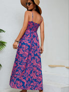 Elevate your sun-drenched wardrobe with the enchanting silhouette of our Women's Purple Floral Maxi Dress. This stunning floor-length piece features a vibrant, large-scale botanical print in contrasting pink and purple tones that make a bold, feminine statement. The design is centered around a highly flexible smocked bodice, providing a secure, body-hugging fit that beautifully transitions into a voluminous, flowing skirt. This dress offers a dreamlike, ethereal feel. It fits beautifully for any social gathering. With its delicate spaghetti straps and lightweight construction, this dress serves as a luminous centerpiece for your seasonal collection, ensuring you remain the best-dressed guest at every outdoor event.